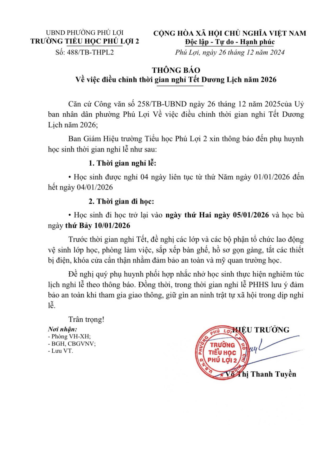 Thông báo về việc nghỉ Lễ Tết Dương Lịch năm 2026